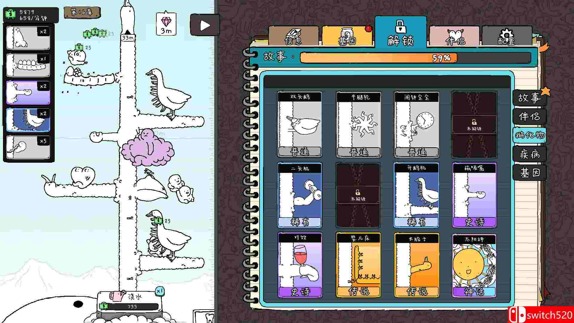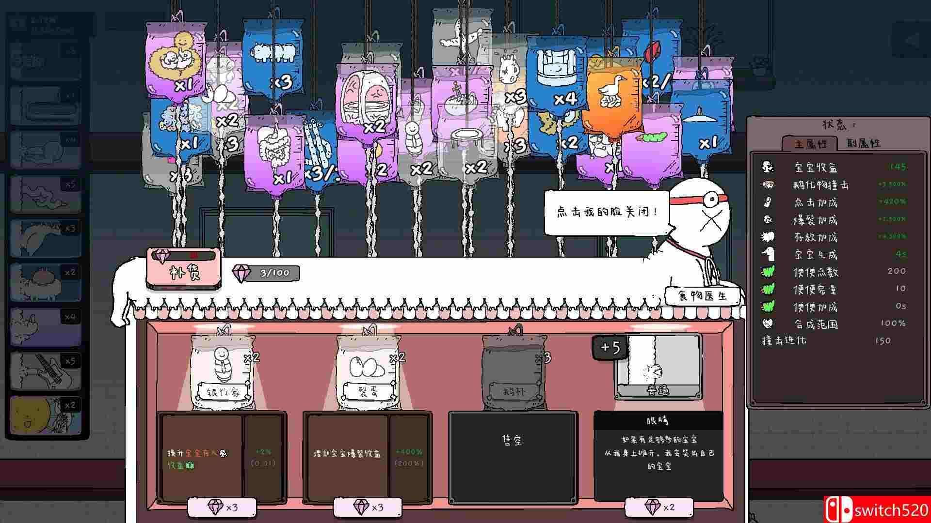 《神经鹅》是一款动作冒险类(ACT)游戏,《神经鹅》是一款看似猎奇,实则治愈的策略摆放游戏。在每一关里,你需要在鹅树上自由摆放装置、合成鹅宝、构筑流水线,以达到通关数值。每一关都能获得骨头,用来点亮局外成长系统中的巨根天赋,开启更深层的自动化。此后,只需平静观赏鹅宝在碰撞中为你带来秩序与繁荣。无论何时,请谨记:神经鹅——关心您的精神健康。switch520
